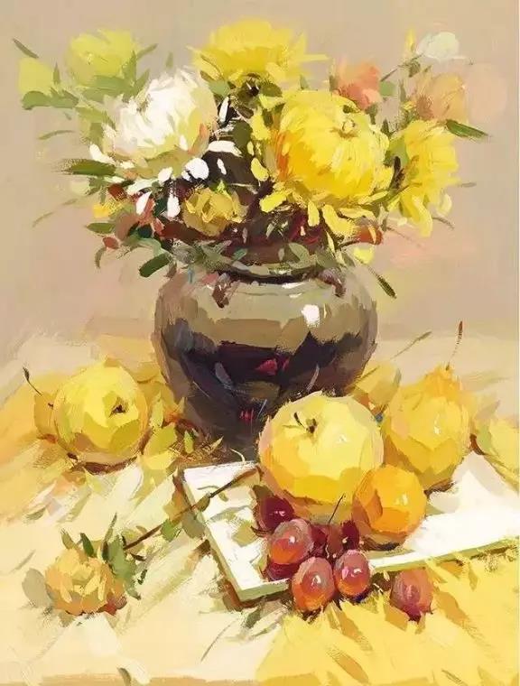 水粉有人會(huì)畫的很灰,整體沒有亮的感覺,水粉還是要多用亮色尤其是在水果上,在構(gòu)圖是一定要明確整體的畫面。