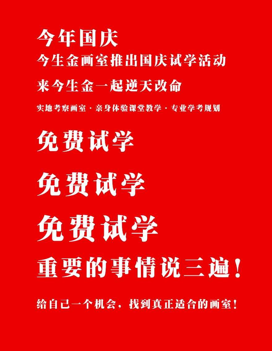 今生金畫室具備一流的師資團隊,針對國慶試學的同學,也將用最優(yōu)的師資指導學生,讓學生感受最專業(yè)的教學。最高效率,提升專業(yè)能力。
