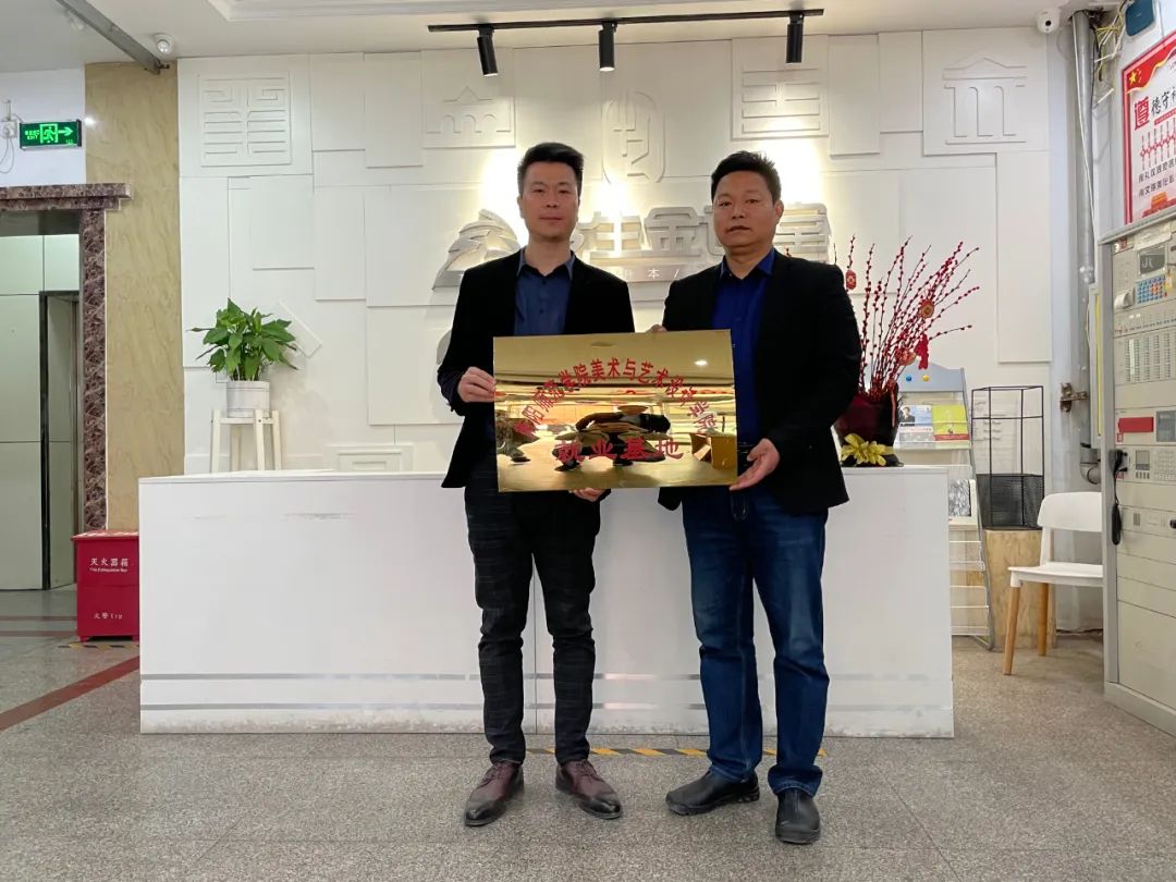 就業(yè)基地基地授牌儀式┈┄美術(shù)與藝術(shù)設(shè)計學院朱軍獻院長(右)、今生金校長王勤剛(左)
